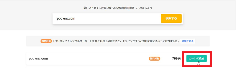 別のドメイン名で再度検索し、取得できるドメインをカートに追加します。