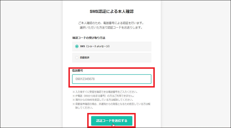 確認コードを受け取る電話番号を入力して「認証コードを送信する」をクリックします。