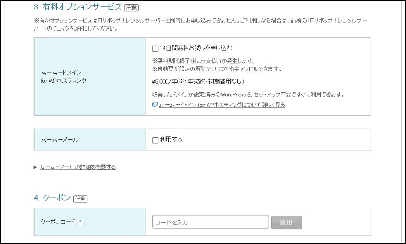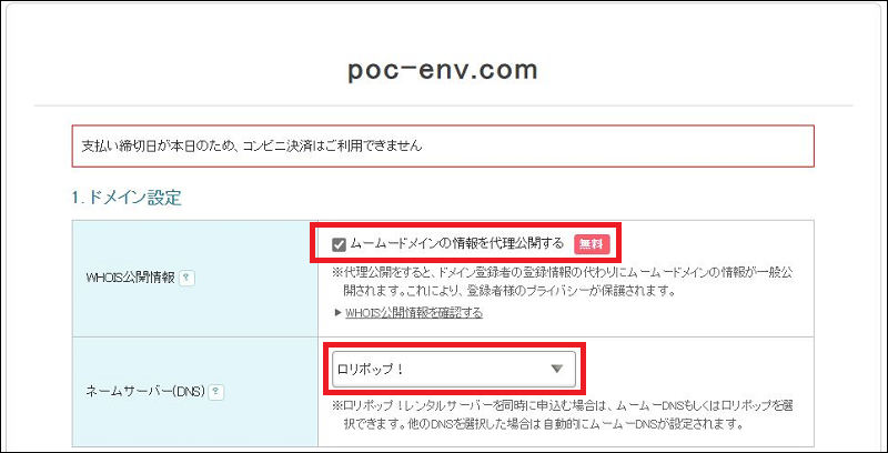 ・WHOIS公開情報…「ムームードメインの情報を代理公開する」にチェック