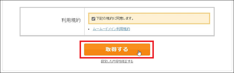 申込内容を確認し、利用規約に同意して「取得する」をクリックします。